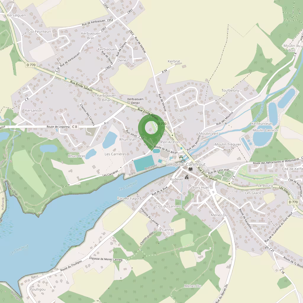 Hôpital-Camfrout ist eine kleine bretonische Gemeinde am Ufer des Flusses Camfrout im Westen des Finistère. Ihre Landschaft verbindet Bocage, Mündung und Feuchtgebiete, typisch für die nördlichen atlantischen Ufer. Das Dorf entfaltet sich langsam zwischen alten Häusern und Wasserläufen und bietet eine ruhige Atmosphäre, die bei Wanderern und Vogelbeobachtern geschätzt wird. Die Lage ermöglicht einfachen Zugang zu städtischeren Zentren wie Brest und Landerneau und bewahrt dabei eine starke ländliche Identität.