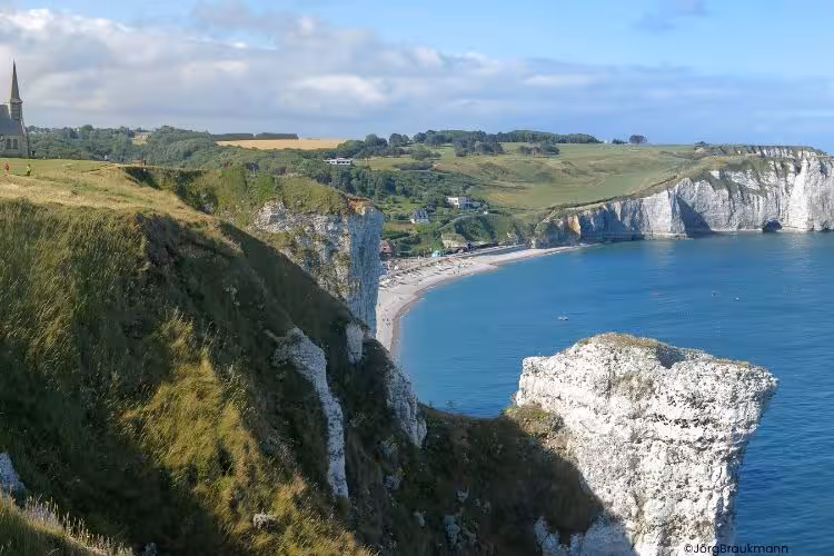 Étretat è un villaggio costiero famoso per le sue scogliere di gesso bianco che precipitano nella Manica. Il lungomare conserva l'atmosfera di una località balneare del XIX secolo, con una spiaggia di ciottoli e passeggiate che attraggono pittori e passeggiatori. Le formazioni rocciose scolpite dal mare sono visibili da belvedere raggiungibili a piedi. Il piccolo centro conserva negozi, caffè e una vita turistica sostenuta in stagione.